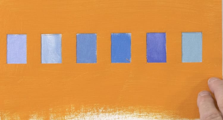 En revanche, si vous placez ce même bleu à côté de sa couleur complémentaire, l’orange, il deviendra immédiatement beaucoup plus intense.